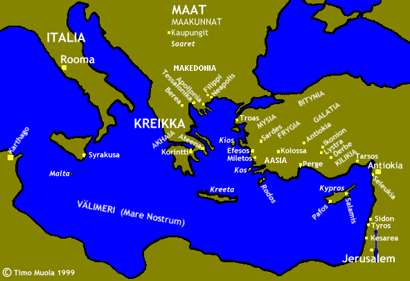 Kartta Paavalin lähetysmatkojen tärkeimmistä kaupungeista ja saarista